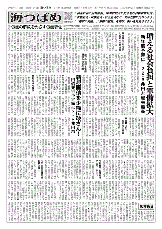 ●1514号 2026年1月11日 【一面トップ】増える社会負担と軍備拡大 ――新年度予算は122・3兆円と過去最高 【一面サブ】 新規国債を少額に改ざん! ――国債発行予定額は3・8兆円増 【コラム】 飛耳長目 【二面トップ】 衣を替えただけの「徴用工制度」 ――外国人技能実習制度から育成就労制度へ 【二面サブ】 米国のベネズエラ軍事侵攻糾弾! ――解き放たれた暴君トランプ ※『海つばめ』PDF版見本 【1面トップ】増える社会負担と軍備拡大新年度予算は122・3兆円と過去最高高市政権は、一般会計で過去最大となる来年度当初予算案を決定した。高市は「責任ある積極財政」による「日本列島を強く豊かにするための予算」と言う。しかし、実際はバラ撒きと軍事偏重であり、そのツケは将来の労働者、働く者の負担となるのは必至である。 ◇高市政治「安定」のためのバラ撒き策歳出については、〝政治的安定〟のためと称して連携した、維新や国民民主の要求が予算化されている。 具体的には、維新、公明(後、与党を離脱)と結んだ高校授業料の無償化(今年4月より実施)である。私立(全日制)の生徒への支給上限は年収によって11・88万円~39・6万円であったが、所得制限をなくし、一律で45・72万円を支給する。予算規模は6174億円。それと共に、教育にかかる家計軽減策として、公立小学校給食無料化に1649億円計上。これも所得制限なしである。生活にゆとりのある豊かな家庭も含めた授業料や給食費の無償化政策は、有権者の歓心をかうためのバラ撒き策でしかない。 一方、歳入についても、国民民主との提携のための「合意」で、「物価騰貴対策」として所得課税最低限(「収入の壁」)が160万円から178万円に引き上げられる。これによる年間の減税額は年収200万円~600万円の人で0・8万円~3・7万円となり、税の減収額は年間約6500億円と推計されている。 だが、確かな財源の当てもないこうしたバラ撒き策は、物価騰貴をもたらす一因となっている。「物価対策」と言いながら、他方では物価騰貴を促進する政府の政策は矛盾しており、非課税の低所得者は勿論、スズメの涙ほどの減税が行われたからといって生活困難を打開するものではない。 ◇給付の抑制と負担増加の社会保障歳出で最大の社会保障関係費は39・1兆円と、25年度当初予算と比べて2%増となった。しかし、物価上昇の3%以下であり、予算では「現役世代の負担軽減」を理由として、給付の抑制と利用者負担の増加が行われる。 その内訳は、患者の負担を抑制するため医療費の月額上限を定めた「高額医療費制度」の見直しで、26年と27年の2回に分け、負担上限額を7~38%上げ、年収650万円~770万円では、上限額を算定する際の基準額が現行の8万110円から11万400円になる。 70歳以上で自宅療養している患者の「外来特例」の負担上限も引き上げられる。「外来特例」は年収370万円以下の人に対して、外来受診の人の医療費よりも低い特例を設けており、住民税非課税世帯を除き月1・8万円であるが、この上限を年収が約200万円以上では2・8万円、約200万円以下では2・2万円に上がる。住民税非課税世帯も現行の0・8万円から1・3万円に上がる。 薬の患者負担も見直しされ、医師の処方箋が必要な医薬品のうち、市販薬と成分など同一のものがある「OTC類似薬」は薬剤費の25%を「特別料金」として患者の負担となる。残りの75%は保険が適用され、自己負担は1~3割。これらはまず77成分、約1100品目を対象として、26年度に法案提出、27年度から実施の予定である。診療費や医薬品の負担増は低所得の高齢者、家族にとって大きな負担となる。 維新は、「OTC類似薬」を保険適用除外とすれば、医療費を1兆円規模で削減できると言ったが、高齢者にとって身体の故障が多くなるのは自然のことで、「現役世代の負担軽減」を理由に、高齢者に負担を押し付けるのは暴論だ。必要なことは、老齢になって身体の故障が少なくなるよう、現役世代の生活・労働環境を整備することである。 ◇軍事費は初の9兆円を突破軍事費は9・3兆円(予算の7・3%)と、当初予算として初めて9兆円を突破した。そして26年中に安保関連3文書を改訂し更なる軍備増強に突き進もうとしている。 軍事費の主要な内容は、ドローンなど無人機を使った新たな防衛体制の構築(1001億円)や、敵の射程外からミサイル拠点を攻撃できる「スタンド・オフ・防衛能力」の強化(9733億円)、陸上自衛隊駐屯地には「地対艦誘導弾」改良型発射装置(1770億円)。その他、迎撃が難しいマッハ5で飛ぶ「極高速誘導弾」(301億円)を計上。海上自衛隊では新型護衛艦(1043億円)、潜水艦(1208億円)など。「専守防衛」「自衛」はとっくに死語となり、自衛隊は最新兵器を装備した攻撃的、強力的な軍隊となっている。 英、伊との共同の次期戦闘機開発に続いて自民、維新は輸送・警戒など「5類型」に制限された「武器輸出」の規制撤廃に動き出し、高市首相は「安全保障と経済成長の好循環」を掲げ、軍需産業分野への支援を打ち出している。しかし