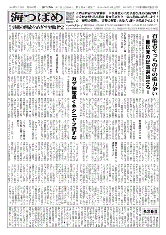 ●1507号 2025年9月28日 【一面トップ】 有権者そっちのけの権力争い ――自民党の総裁選始まる 【一面サブ】 ガザ抹殺急ぐネタニヤフ許すな 【コラム】 飛耳長目 【二面トップ】 『資本論』を学べと共産党 ――だが、学ぶほど共産党の路線と衝突する 【二面サブ】 保護主義か、自由貿易か? ――トランプ関税をめぐって ※『海つばめ』PDF版見本 【1面トップ】有権者そっちのけの権力争い自民党の総裁選始まる自民党の新総裁を決める選挙戦が始まった。9月22日告示、10月4日開票である。名乗りを挙げたのは小泉進次郎、高市早苗、林芳正、茂木敏充、小林鷹之の5人で、いずれも昨年の総裁選に出馬したメンバーである。衆院に続き参院でも少数与党に転落して、「解党的出直し」を誓ったはずの自民党だが、5名の立候補者の出馬表明からは、自民党政権にノーを突き付けた、有権者からの厳しい批判への反省は全く感じられない。 ◇何も変わらない「政治とカネ」問題参院選での自民党大敗の原因となったのは「政治とカネ」問題。自民党自身が「総括」で、「政治とカネ」は自民党が「信頼を失った」原因だと述べた。しかし、出馬会見でこの問題に触れたのは、茂木と小泉だけである。 茂木は「禁止より公開」で透明性を高めることが重要、政党助成金と個人献金、企業・団体献金のバランスをとることが望ましい、としている。しかし、これは石破内閣が国会で述べてきたことと基本的に同じだ。石破は企業献金を禁止することは憲法が謳っている「自由」に反するとして反対し、誰でも政治資金収支報告書を容易に見ることが出来るように「透明性」を高めるということでごまかしてきた。茂木は、さらに政党助成金、個人献金との「バランス」を付け加えたが、それを具体的にどうするのかということは述べず、「バランスをとることが望ましい」という曖昧な言葉で済ましている。結局は、石破答弁と同じで、企業献金継続の立場である。 小泉も、「政治資金の透明化の徹底で『政治とカネ』の問題が起きない土壌を整える」と、これまでの石破の説明を繰り返すにとどまっている。小泉は党の「改革派」を看板にしてきたが、右派の票を得るために右派の議員連盟・「創世会」所属の加藤勝信を選対本部長に据えたり、持論である「選択的夫婦別姓」を封印するなどしている体たらくぶりである。 その他、高市は「党の規律や財務体質を根本から改める」などと抽象的な言葉で済ませ、有権者の批判をかわすために「政治とカネ」に触れようともしない。まったく有権者を馬鹿にしている。 ◇経済発展の空約束経済政策では、積極財政派と財政慎重派の二つの傾向に分かれている。 積極財政を代表するのは旧安倍派の高市と「若手」を売りとしている小林である。 高市は「世界の潮流は行き過ぎた緊縮財政ではなく社会の課題解決に向けて官民が連帯して投資を拡大する、責任ある積極財政へと移行している」が、日本も「『ワイズスペンディング』で暮らしの安全安心を確保し、雇用と所得を増やし、消費マインドを改善し、税収が自然増に向かう強い経済を実現する」と訴えている。「責任ある積極財政」とか「ワイズ(賢い)スペンディング」などの空文句を除けば、金融緩和や借金財政で投資を活発化させ、経済発展を実現するという「アベノミクス」と同じである。 高市は積極財政は「世界の潮流」だと言うが、これは主としてポヒュリストの言い分であり、また、「アベノミクス」が僅か7年間で国の借金を250兆円も積み上げ(対GDP比189%から207%へ)、経済発展どころか今日の経済の低迷、そして労働者に生活困難をもたらしたことを少しも省みることなく、あらぬ幻想を振りまいているのである。 一方、積極財政に慎重である林は、岸田、石破二つの政権の路線を継承するという。その路線の一つは、「賃上げと経済の好循環」論のことである。賃上げを行う企業に対して、政府が補助金を支給し、賃金を引き上げ、消費が増大し、投資が拡大、それによって経済が発展するという理屈である。しかし、もともと賃上げは物価上昇の後追いでしかなく、この〝理論〟はとっくに破綻している。 積極財政派であれ慎重派であれ、唱えている「経済発展」は空約束でしかない。 ◇軍備増強では一致軍備増強、日米安保深化では各候補とも足並みをそろえている。 最も強硬姿勢なのは高市である。高市は、「防衛力の裏付けのない外交は弱い」ことを実感した、と帝国主義外交を正当化し、さらに中国、ロシア、北朝鮮の3核保有国に囲まれている日本は、「安心、安全」を確保するために日米安保軍事同盟の強化、防衛産業育成の必要性を訴えている。 高市に次ぐのは小林である。小林は「防衛費の予算措置はGDP2%では到底足らない。国家安全保障戦略を早期に改正し、必要な額を積む」と軍備増強を訴え、そしてさらにAIや宇宙などへの大胆な投資」を行って「世界をリードする日本をつくる」と述べている。 そ