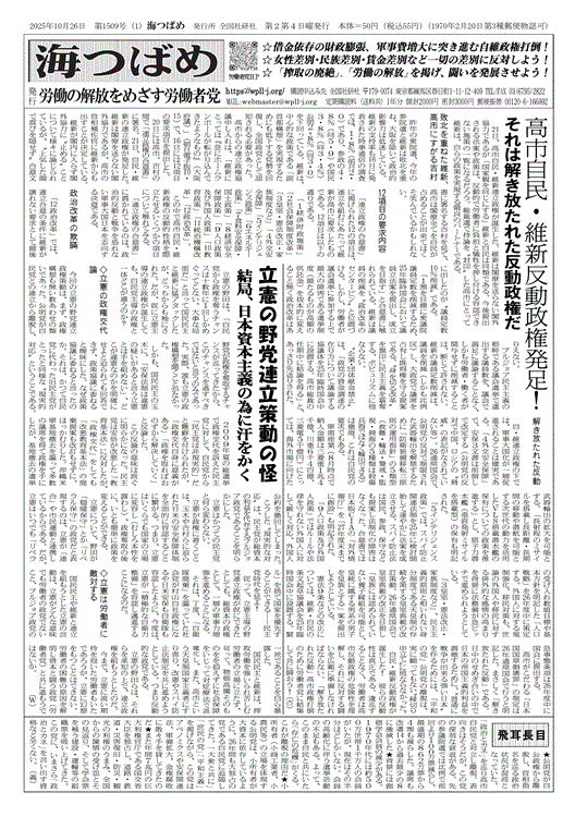 ●1509号 2025年10月26日 【一面トップ】 高市自民・維新反動政権発足! ――それは解き放たれた反動政権だ 【一面サブ】 立憲の野党連立策動の怪 ――結局、日本資本主義の為に汗をかく 【コラム】 飛耳長目 【二面トップ】 非正規労働者は新しい労働者階級か? ――橋本健二の「アンダークラス」論 【二面サブ】 偽りのハマス・イスラエル停戦合意 ――イスラエルは撤退し、ガザ虐殺を止めよ! ※『海つばめ』PDF版見本 【1面トップ】高市自民・維新反動政権発足!それは解き放たれた反動政権だ21日、高市自民・維新連立政権が誕生した。維新は閣僚を送らない閣外協力であるが「国家観を同じにする」維新と自民は同類である。今後提出される法案や政策は、反動的で労働者に負担と犠牲を押し付ける容認できない施策の一覧になるだろう。総裁選で持論を〝封印〟した高市にとって維新は、自らの政策を実現する最良のパートナーである。 ◇敗北を重ねた維新、高市にすがる吉村昨年の衆院選、今年の参院選と維新は敗北を重ね、大阪を除いて政治的影響力は低迷している。維新の支持率も16日に発表された時事通信の調査では、1・8%(前月2・0)であり、参政の4・8%(同5・9)や国民3・8%(同3・4%)公明2・8%(同3・0)を下回っている。維新は、中心的な政策である「副首都構想」を実現するためにも低下する党勢を回復し、全国政党として認知される必要があった。 高市からの連立政権協議申し入れは、「維新にとっては『急にホームランボールが転がり込んできたようなもの』(大阪府議)」(朝日電子版10・15)で、16日には12項目の要求項目を提出した。 20日には高市、吉村の間で「連立政権の合意書」に署名。21日、自民・維新の連立政権が発足した。維新は閣僚を送らない閣外協力であるが、高市の首相補佐官に維新からも出すことが決定している。 維新が閣内に入らず閣外協力に〝止める〟ことについて様々に論じられているが、〝上気した顔で喜びを隠せず〟合意文書に署名する吉村を見て、高市は閣僚全てを自民が占めることが出来てほくそ笑んでいるかもしれない。 ◇12項目の要求内容「連立政権の合意書」に掲げられた12の項目は、連立を組むにあたって維新が高市に要求したものである。12項目は以下の通りである。 「1経済財政施策」「2社会保障制度改革」「3皇室・憲法改正・家族制度など」「4外交安全保障」「5インテリジェンス政策」「6エネルギー政策」「7食料安全保障・国土政策」「8経済安全保障政策」「9人口政策及び外国人政策」「10教育政策」「11統治機構改革」「12政治改革」。 この中で高市自民・維新政権の反動的性格を際立たせるいくつかの項目について触れてみる。 「連立政権の合意書」に貫かれているのは、政治的反動と戦争を恐れない軍事大国日本を志向する決意である。 ◇政治改革の欺瞞「12政治改革」では、連立合意の条件に維新が譲れない要求として最後に出したのが〝議員定数10%削減〟である。 「1割を目標に衆議院議員定数を削減するため、25年臨時国会において議員立法案を提出し、成立を目指す」と合意書に触れられている。維新は議員の削減を〝政治改革のセンターピン〟と位置づける。しかし、労働者が議会選挙に参加する上で最大の障害である選挙制度(最たるものが高額の供託金)を抜本的に変えること無く政治改革はありえない。 ブルジョア民主主義の根幹である議会選挙で選出する議員数を、議会で満足に議論することなく、しかも労働者・働く者が関与せずに削減することは、断じて許されない。維新の議員定数削減は、議員を削減(しかも比例区)し、大政党で議席を占有し既得権を守る提案である。〝身を切る改革〟を旗印に民主主義を簒奪する、ポピュリズムに他ならない。 〝企業・団体献金禁止〟は、「政党の資金調達の在り方について議論する協議体を25年臨時国会中に設置する。高市総裁の任期中に結論を得る」と、あっさり先送りされた。 ◇解き放たれた反動自・維連立政権の下では、軍事大国化が一層促進されることは確実である。「4外交安全保障」で、安保3文書は前倒しで改定する(公明党の反対で中国、ロシアの〝脅威〟の表記がなされていない等)。26通常国会で、公明党の反対で制限された武器輸出を解禁するために「防衛装備移転三原則の運用指針」の5類型(救難・輸送・警戒・監視・掃海の5種類は殺傷兵器ではなく輸出できる)は撤廃。これは自民党の要求でもある。 軍需産業(8月時点で納入金額は三菱重1兆4千億、川重6千4百億、三菱電5千億円)にとっては、海外市場に向けた武器輸出の拡大を可能とする。「長射程のミサイルを搭載し長距離・長期間の移動や潜航を可能とする次世代の動力を活用したVLS搭載潜水艦の保有についての政策を推進する」とし、原子力潜水艦(垂直発射ミサイルを搭載型)の保有も明記された。 「5インテリジェンス政策」では、スパイ防止関連法制を25年に検討開始して速やかに法案を成立させる。スパイ防止法は国民、参政