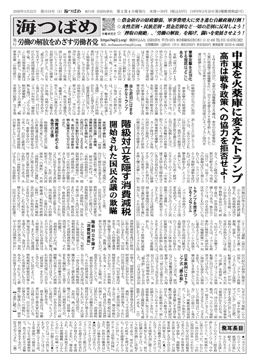 ●1519号 2026年3月22日 【一面トップ】中東を火薬庫に変えたトランプ ――高市は戦争政策への協力を拒否せよ! 【一面サブ】 階級対立を隠す消費減税 ――開始された国民会議の欺瞞 【コラム】 飛耳長目 【二面トップ】 物価上昇で実質賃金低下 ――だが利潤は増大、いかに闘うべきか 【二面サブ】 高市の「働き方改革」 ――労働時間規制の緩和を目論む ※『海つばめ』PDF版見本 【1面トップ】中東を火薬庫に変えたトランプ高市は戦争政策への協力を拒否せよ!1945年3月10日。米軍のB29爆撃機325機は、東京の住宅密集地に大量の焼夷弾で絨毯爆撃を行い。10万人を超える人々を焼き殺した。そして今、イランでは米軍がイスラエルと共に圧倒的空軍力によってイラン国内を連日破壊している。 ◇軍事攻撃を正当化する理屈はどこにある本紙『海つばめ』1518号2面の「トランプのイラン攻撃」記事でも明らかにしたように、トランプやネタニヤフのイランに対する大規模な軍事攻撃を正当化する理屈はどこにもない。 「(邪悪なテロ国家イランの)核兵器保有は許さない」とトランプは主張する。15年に締結したJCPOA(「包括的共同作業計画」米・英・仏・ロ・中・独、イラン・EUで成立した核合意)についてトランプは、合意はイランの①核開発を長期的に抑止できず②ミサイル開発を制限しない③ハマス、ヒズボラの支援を認めている等を理由に18年に破棄。イランに制裁と軍事的圧力をかけた。 昨年6月のイラン核施設に対する大規模な空爆についてトランプは「核兵器計画を完全に破壊したと」誇示した。それを〝都合よく〟忘れて、今年2月オマーンの仲介で行われた核問題高官会議終了後、一方的に〝イランに核兵器放棄の意思はない〟と断定し、会議を軍事攻撃「壮絶な怒り」作戦開始の正当化に利用した。